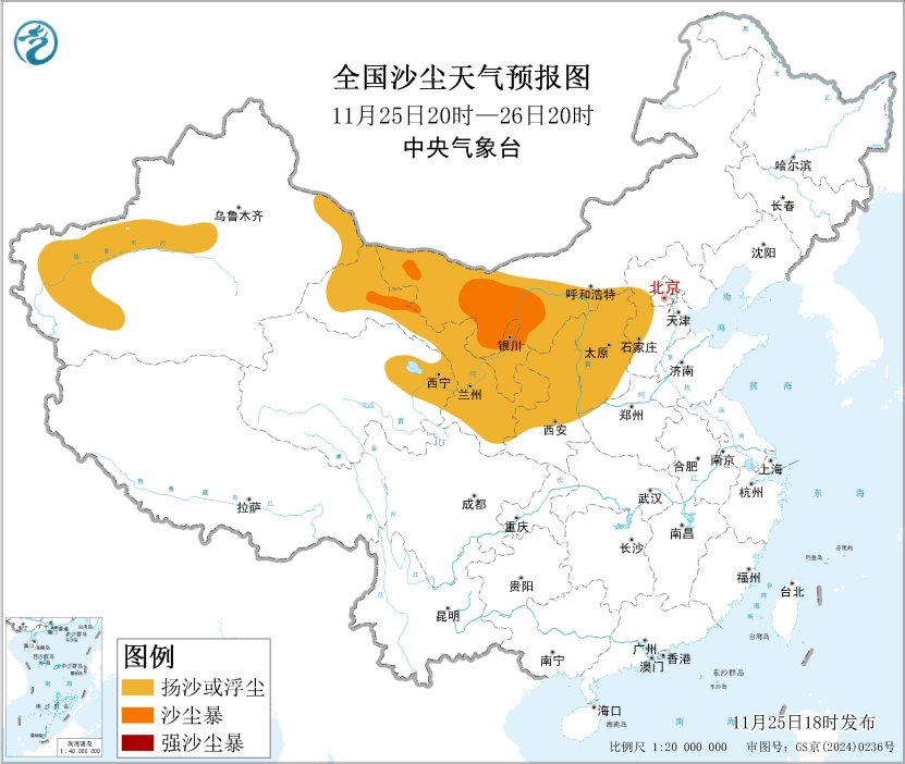 预计,25日20时至26日20时,新疆南部、内蒙古西部、甘肃、宁夏、陕西中北部、山西等地有扬沙或浮尘天气,其中甘肃西部、内蒙古西部、宁夏北部等地的部分地区有沙尘暴。